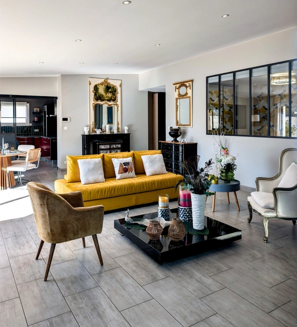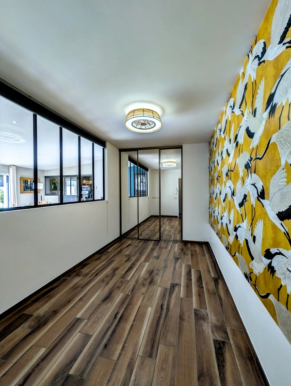 Réception : pièce de vie spatieuse avec cuisine équipée semi-ouverte, complétée par une entrée avec rangements et un cellier-lingerie fonctionnel.